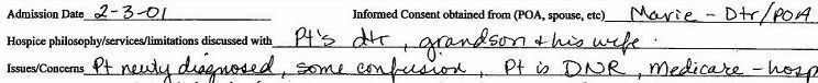 Hospice Southwest, Southwest Washington Medical Center, Planned Outcome #1: Self Determined Life Closure, page 3 of 5 MSW: Krystal Ashling Patient Name: Elvina Roloff. Informed Consent obtained from: Marie -- Dtr / POA. Hospice philosophy / services / limitations discussed with Pt's dtr, grandson & his wife. Issues / Concerns: Pt newly diagnosed, some confusion. Pt is DNR (Do Not Resuscitate). (Information apparently provided by Marie Cheatham.)