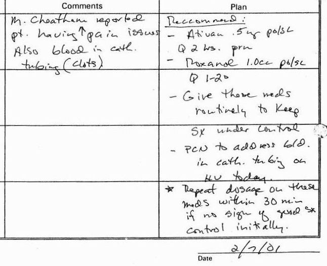 Hospice Southwest, Southwest Washington Medical Center. Nursing On-Call Documentation. Patient Name: Elvina Roloff. Telephone call from: Marie Cheatham. Comments: M. Cheatham reported patient having increased pain issues. Also blood in catheter tubing (clots). Plan: Ativan 0.5 mg po/sl Q 2 hrs prn (by mouth / sublingual every 2 hours as needed). Roxanol (morphine) 1.0 cc po/sl Q 1-2 hours (by mouth / sublingual every 1 to 2 hours). Give those meds routinely to keep Sx (symptoms) under control. PCN (Primary Care Nurse) to addess blood in catheter on HV (home visit) today. Repeat dosage on these meds within 30 minutes if no sign of good Sx control initially. Note: The nurse arrived at Elvina Roloff's home at 10:50 AM. Marie Cheatham refused to let the nurse see Elvina Roloff. Note: No other person independently verified that Elvina Roloff was having increased pain.
